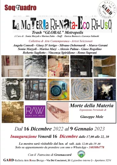 Sarà inaugurata venerdi16 dicembre 2022 nella galleria GARD Galleria Arte Roma Design una nuova edizione della mostra a tematica Ecologica, denominata La Materia Ri-Nata - Trash “Global” Metropolis, nata come Progetto Espositivo Culturale nel 1997, da allora fiore all’occhiello della Galleria GARD.